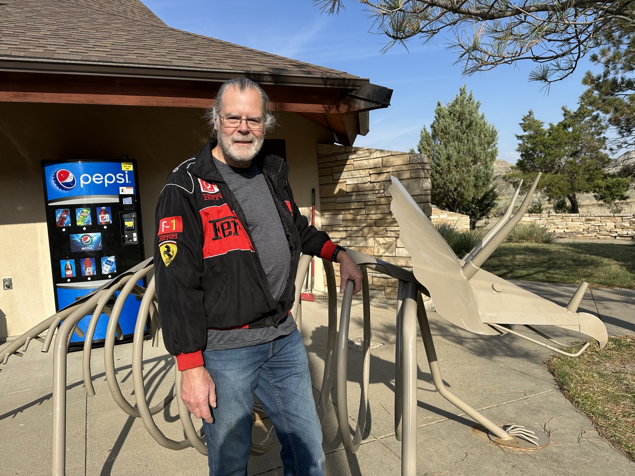 We stopped on our ride out Makoshika State park at the Ranger station. This is just over a mile from our RV site in Glendive, Montana. The area is really well-known for many, many dinosaur finds. This immitation of a metal Stegosaurus was pretty funny. Since it was an "animal", Gloria felt compelled to try to feed it.... |