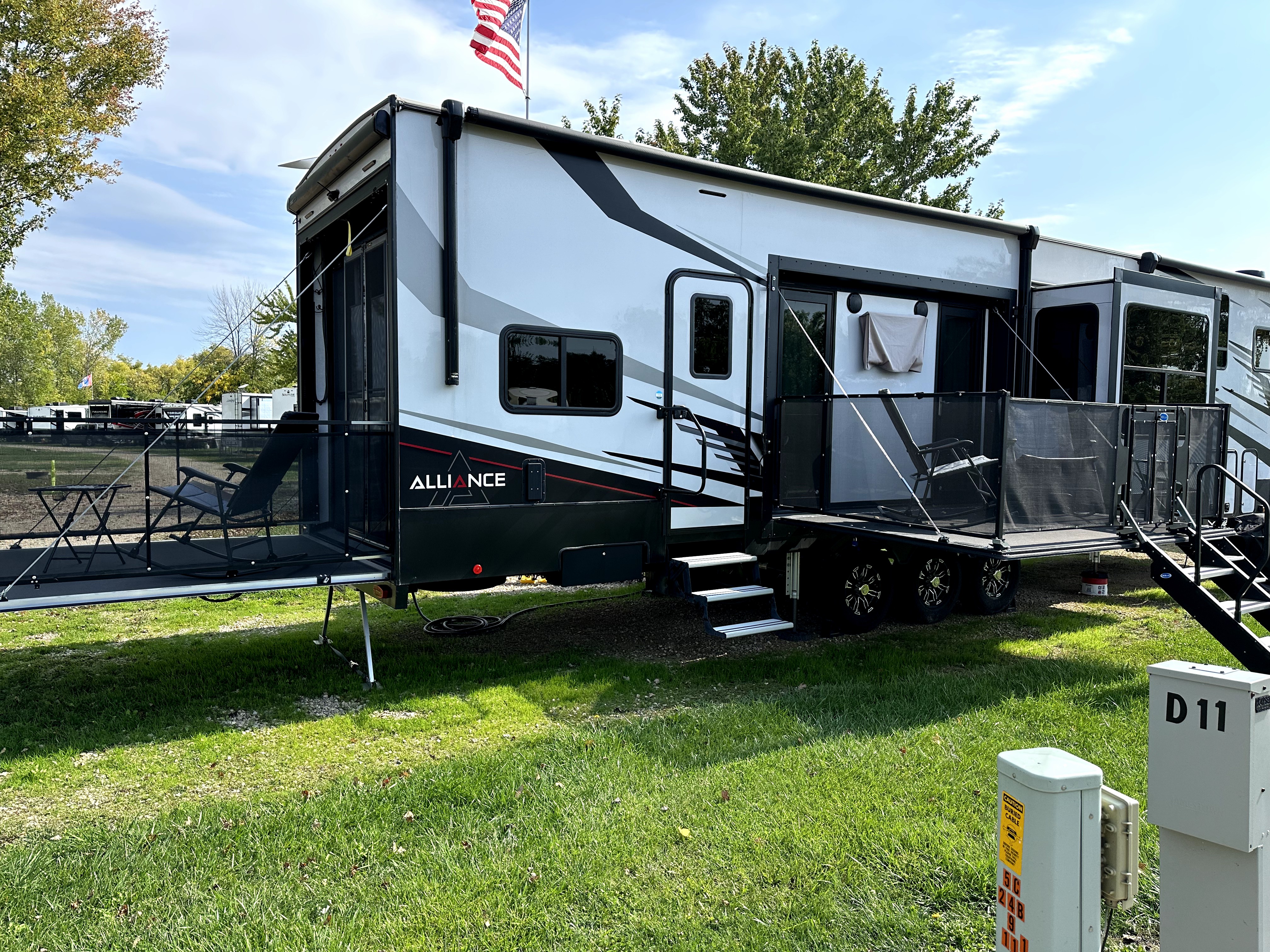 Our next door neighbor in Madison. I had never seen a Toy-Hauler 5th wheel with TWO porchs before! |