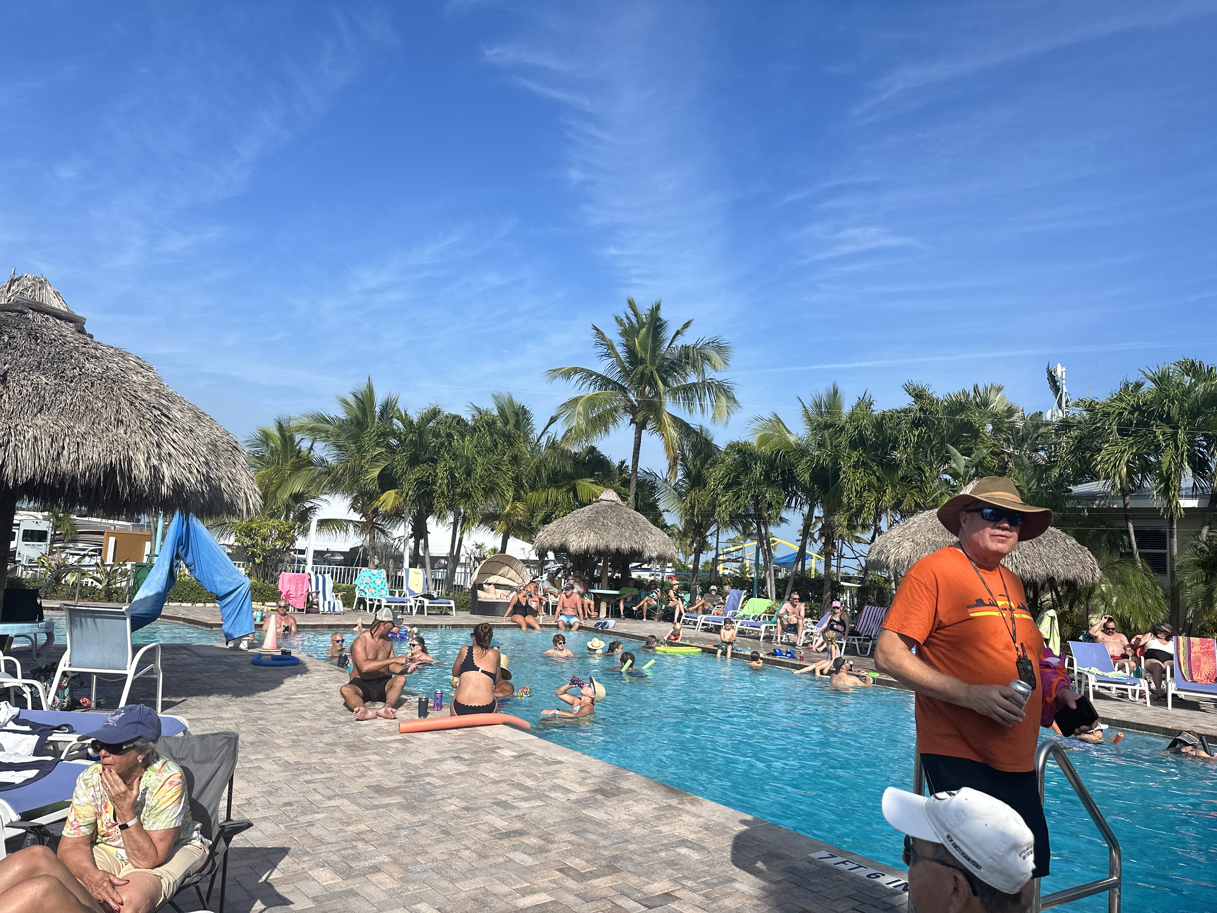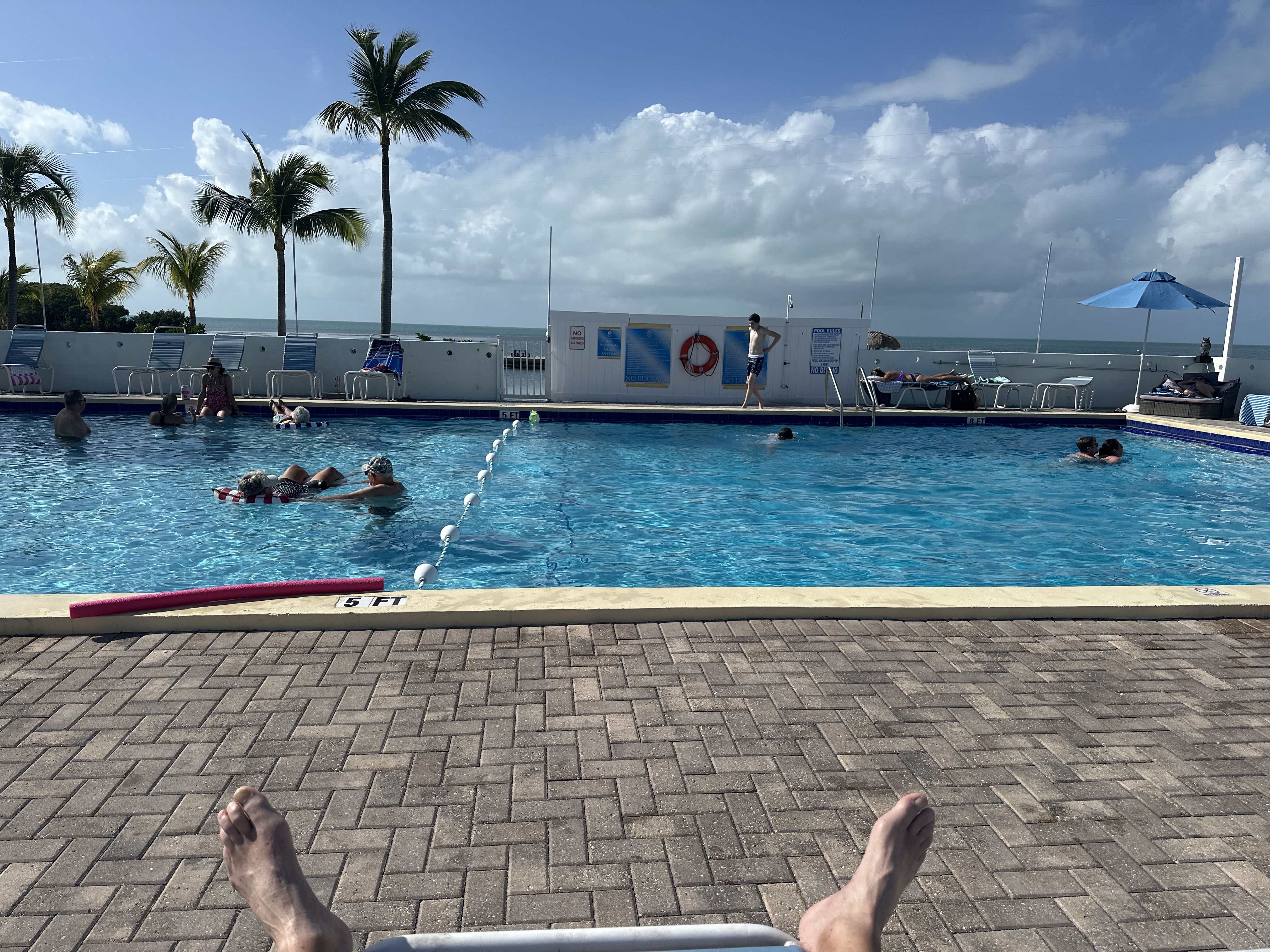 The Saltwater pool at Sunshine Key RV Park. PLENTY of lounge chairs this time! It's about 80 derees and this must be about 1/26/24. |