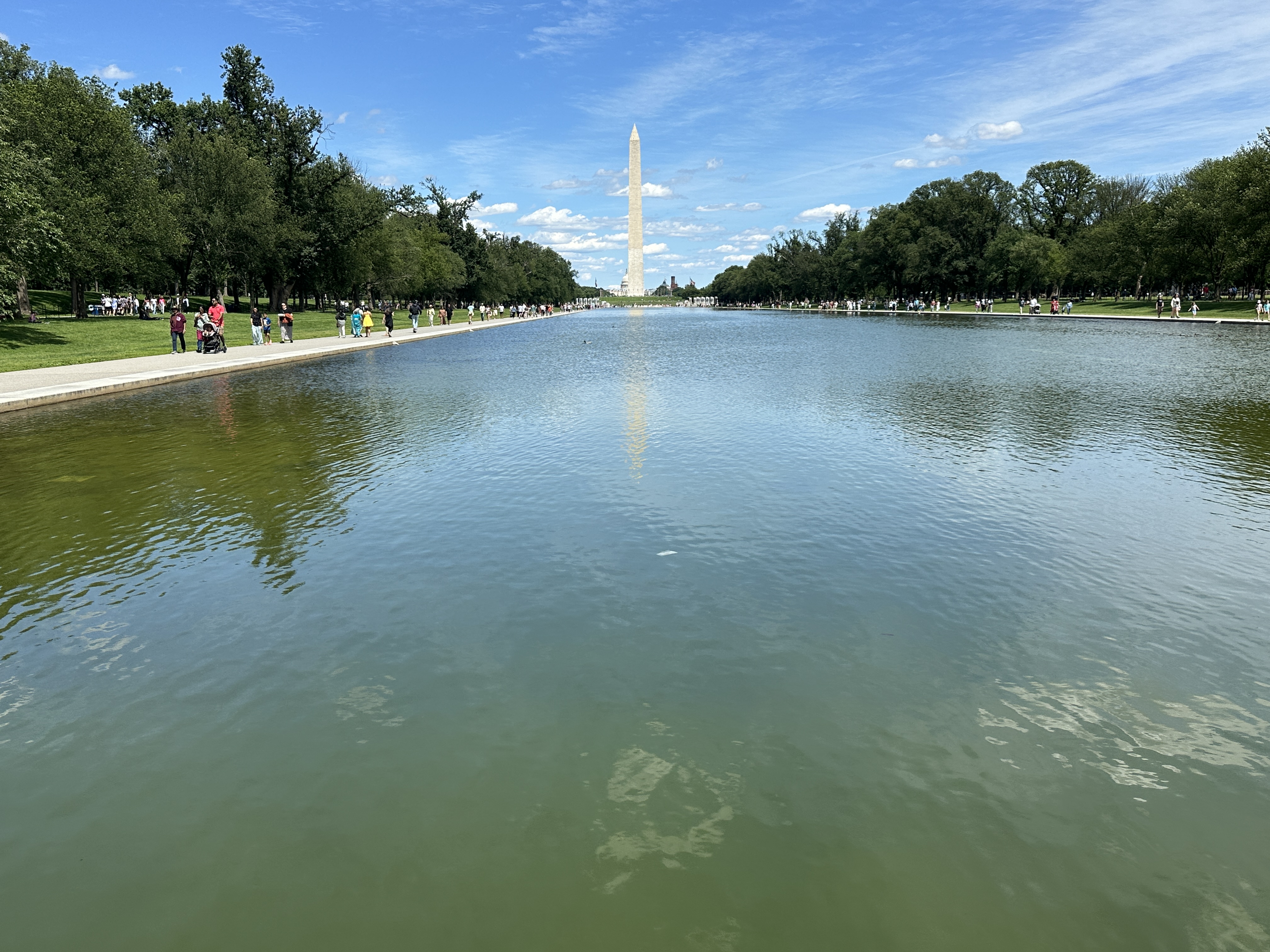 From the top of the steps of the Lincoln Memorial, looking back at the Washington Monument and Reflecting Pool. |
