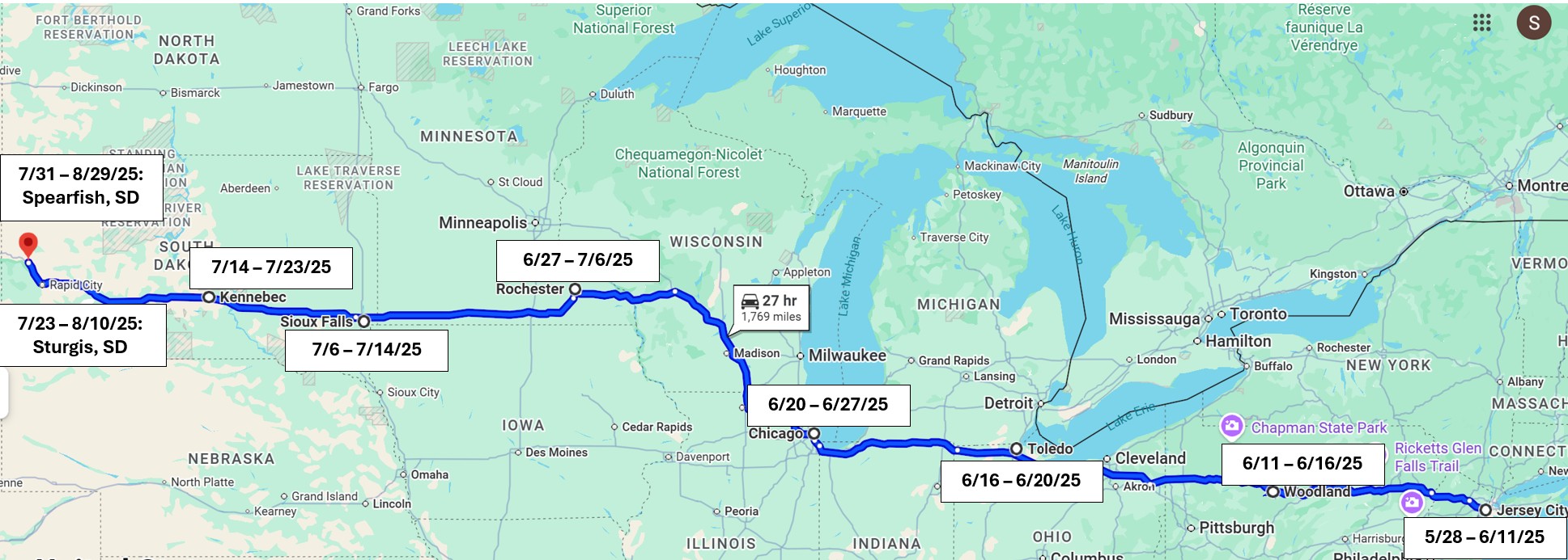Here's a brief map of where we've been for this travel leg -- June 7 - August 20, 2025