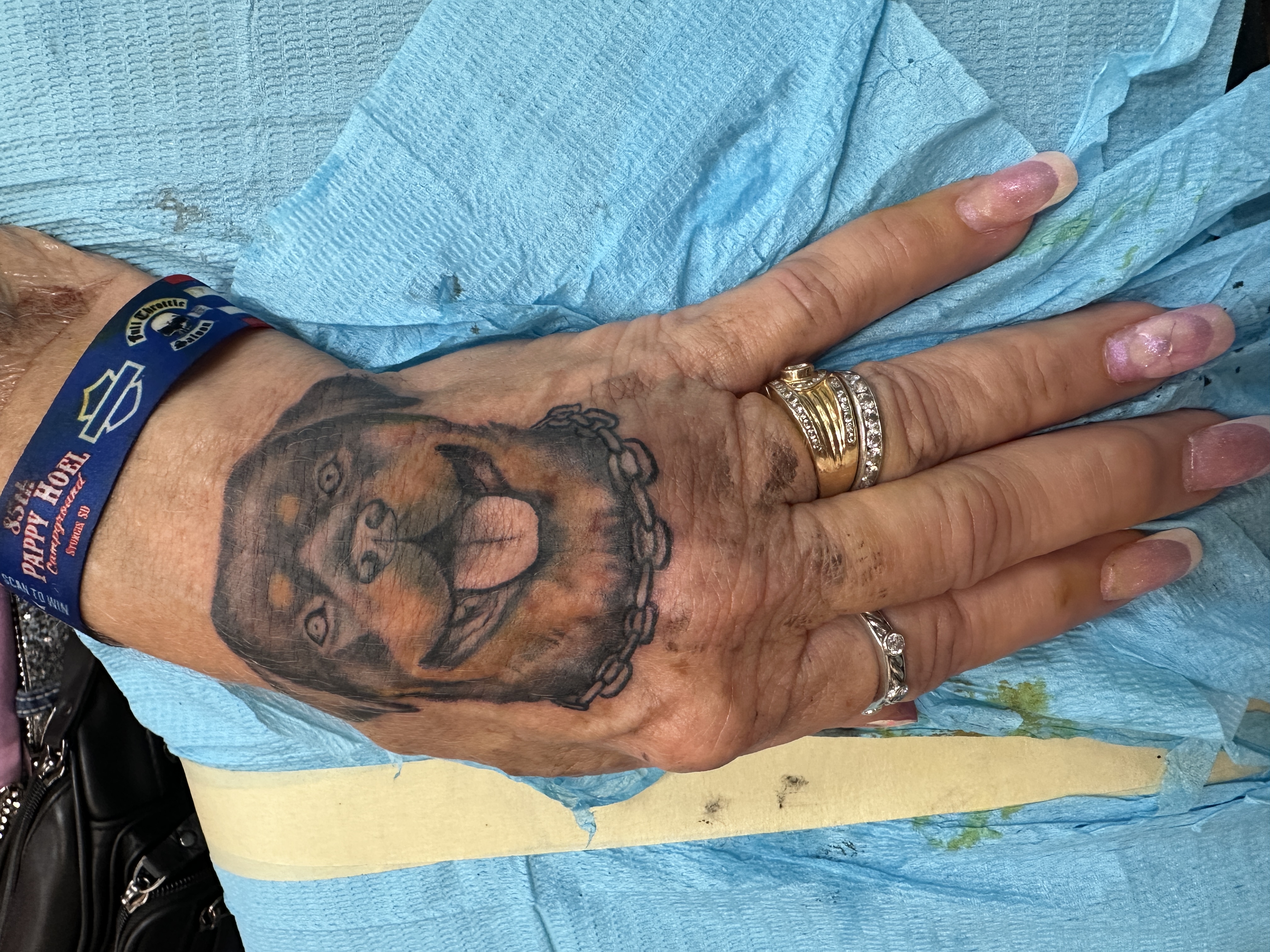 We bounced into one of the MANY tattoo parlors on Main Street and Gloria got a new tattoo on the back of her left hand. |