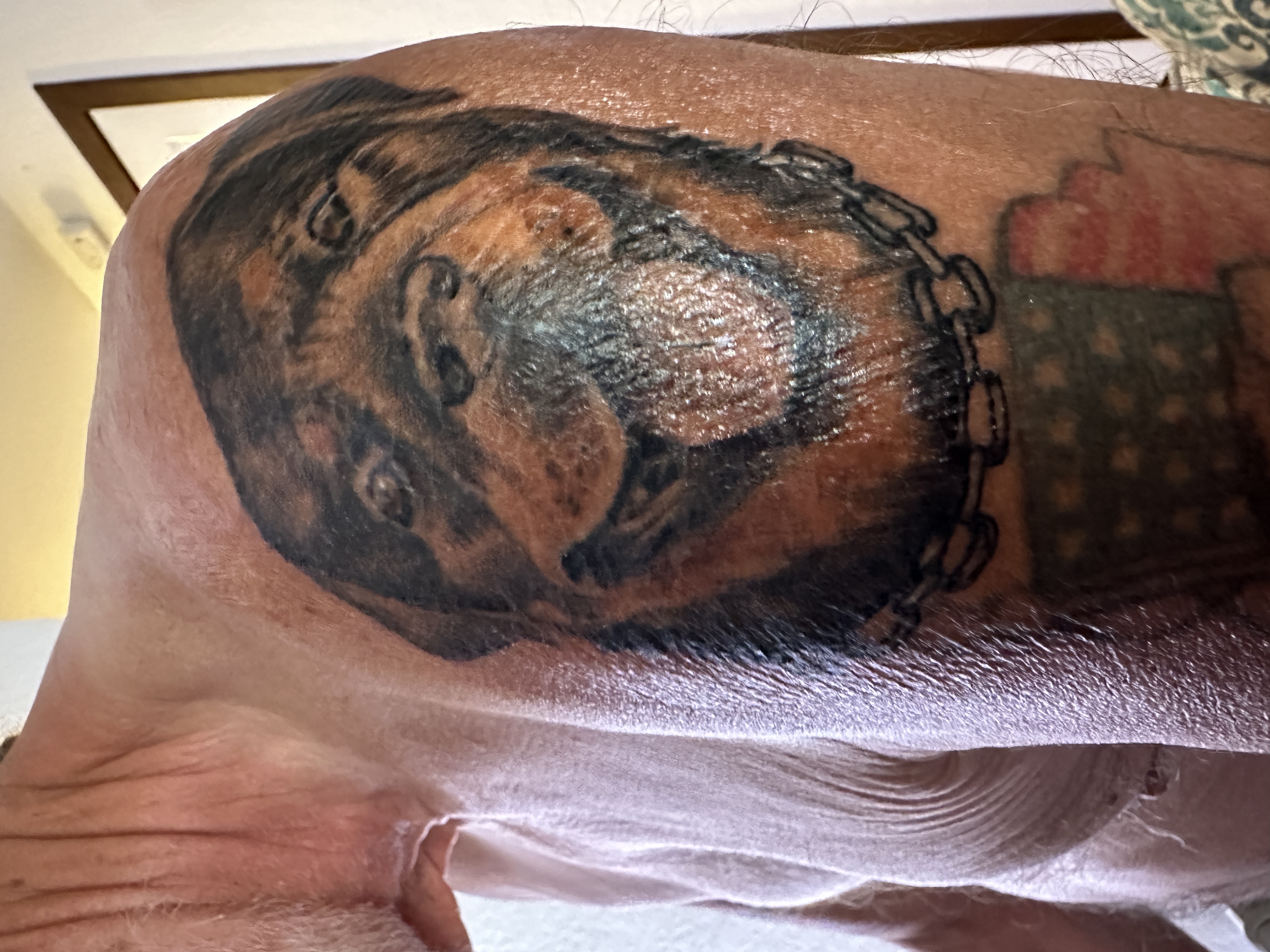 I got two new tattoos, too. this one is of my dear, departed Pittie, Molly. |