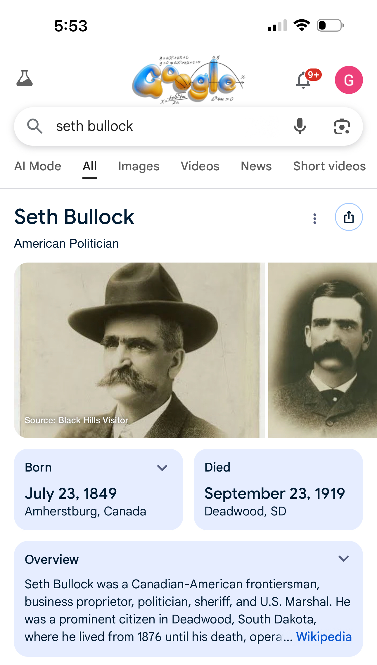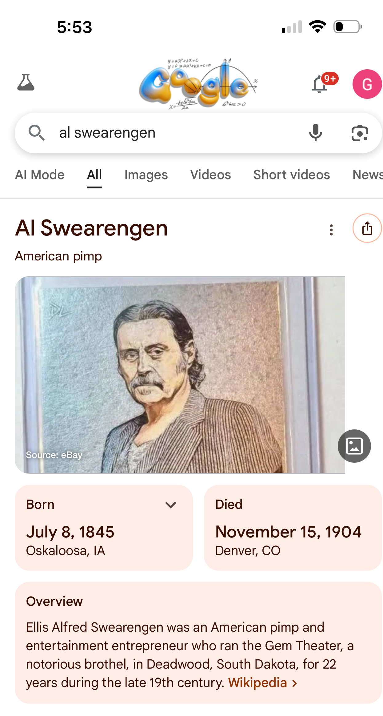 I was a big fan of "Deadwood" when the series was on cable in 2004 and maybe a year or two after. Until we watched the movie on Saturday, 11/29/25, I never even investigated whether any of the main characters were real people. I mean, I knew the answer for Bill Hickock and Calamity Jane, but this fellow, too! |