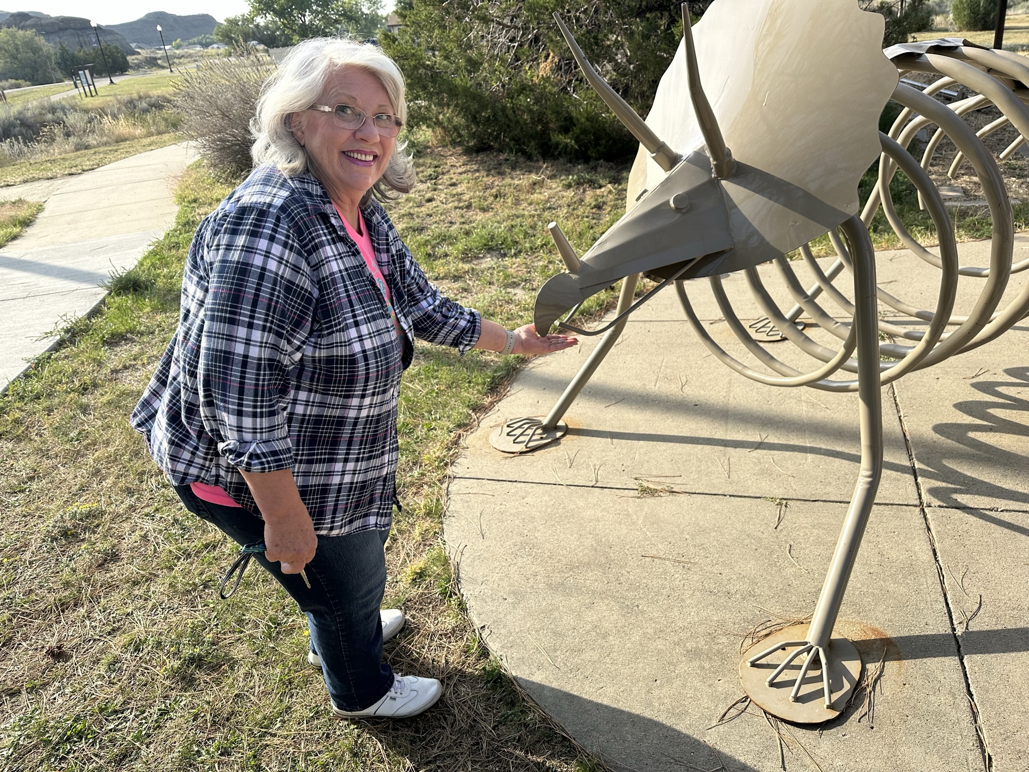 We stopped on our ride out Makoshika State park at the Ranger station. This is just over a mile from our RV site in Glendive, Montana. The area is really well-known for many, many dinosaur finds. This immitation of a metal Stegosaurus was pretty funny. Since it was an "animal", Gloria felt compelled to try to feed it.... |
