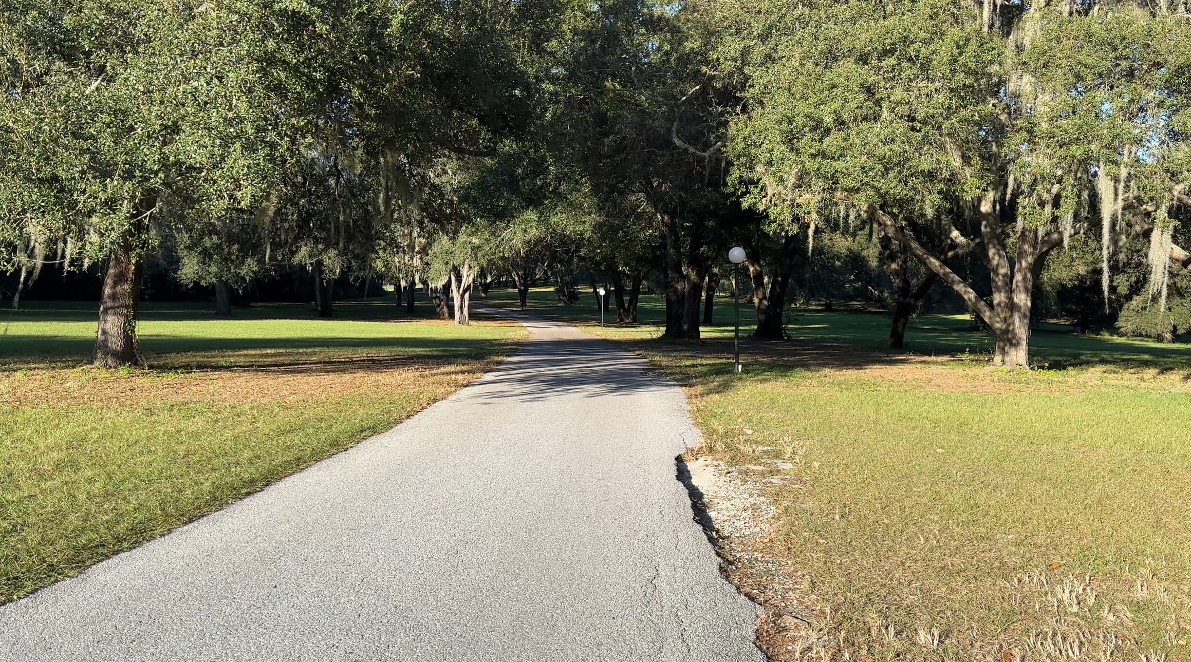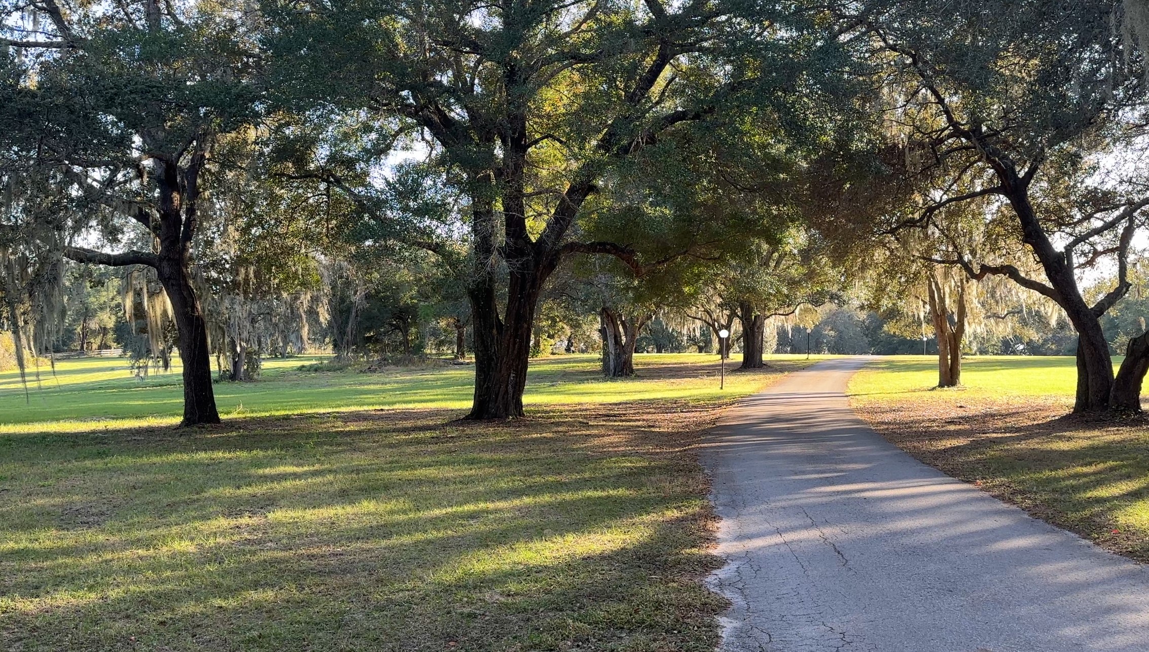 Wednesday, 12/6/23. A stationary, yet panoramic view of the interior of Grand Oaks RV Park. Just a beautiful ride up through the trees toward the exit onto Griffin Road and out to The Villages.
