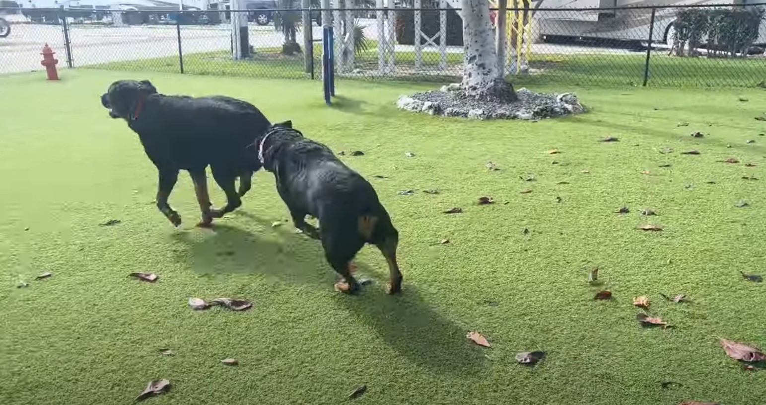 Dakota and Bailey rough-housing at the Orange Blossom KOA Dog Park 2/2/24.