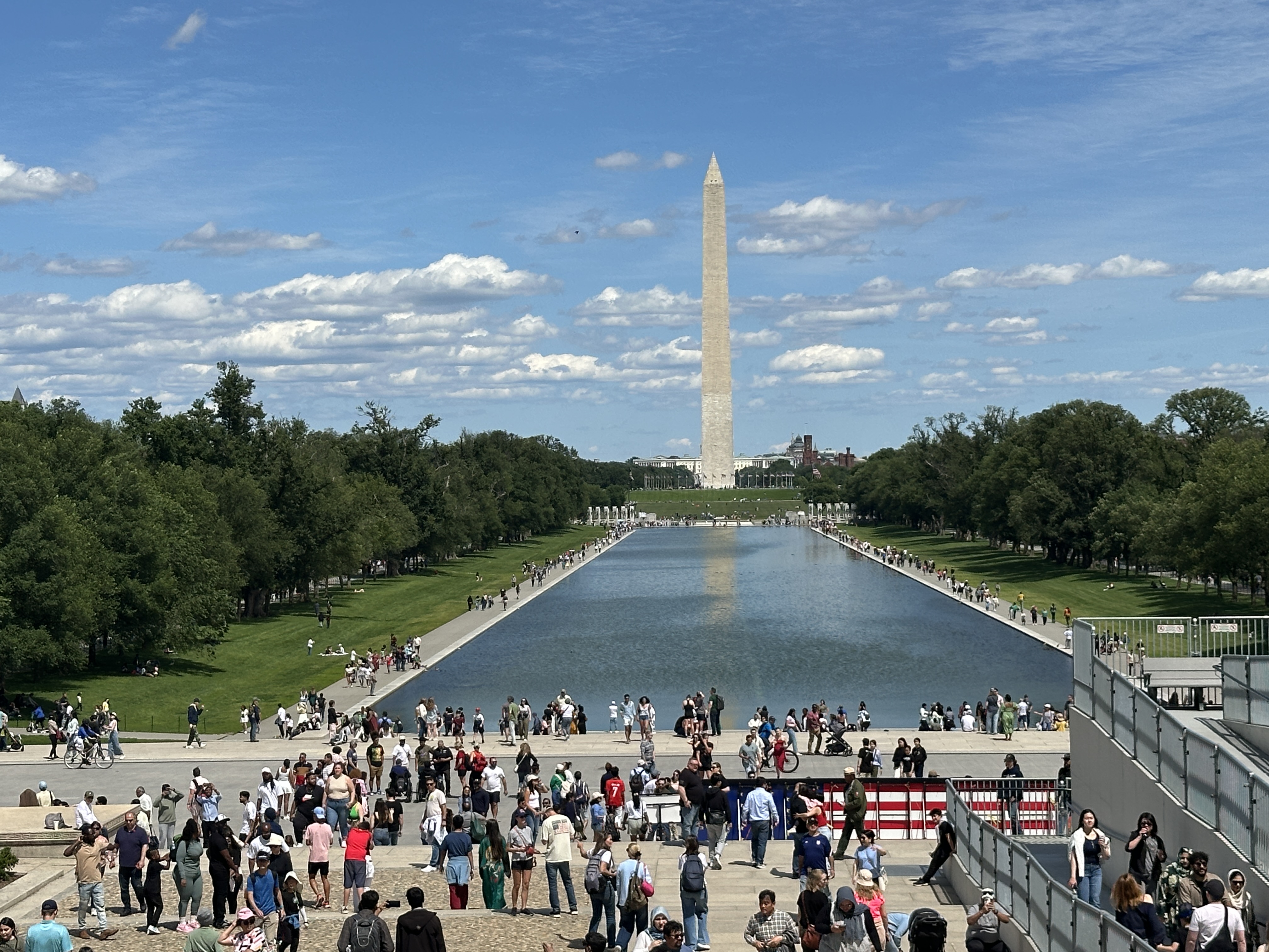 From the top of the steps of the Lincoln Memorial, looking back at the Washington Monument and Reflecting Pool. |