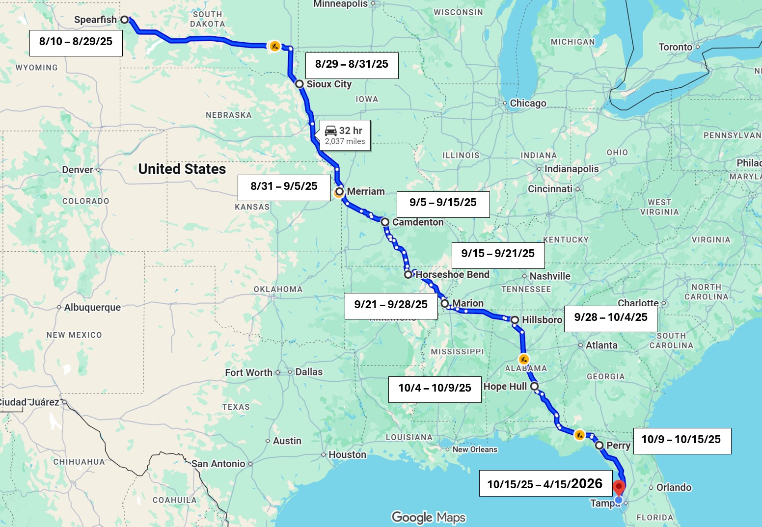 Here's a brief map of where we've been for this travel leg -- August 20 - November 30, 2025