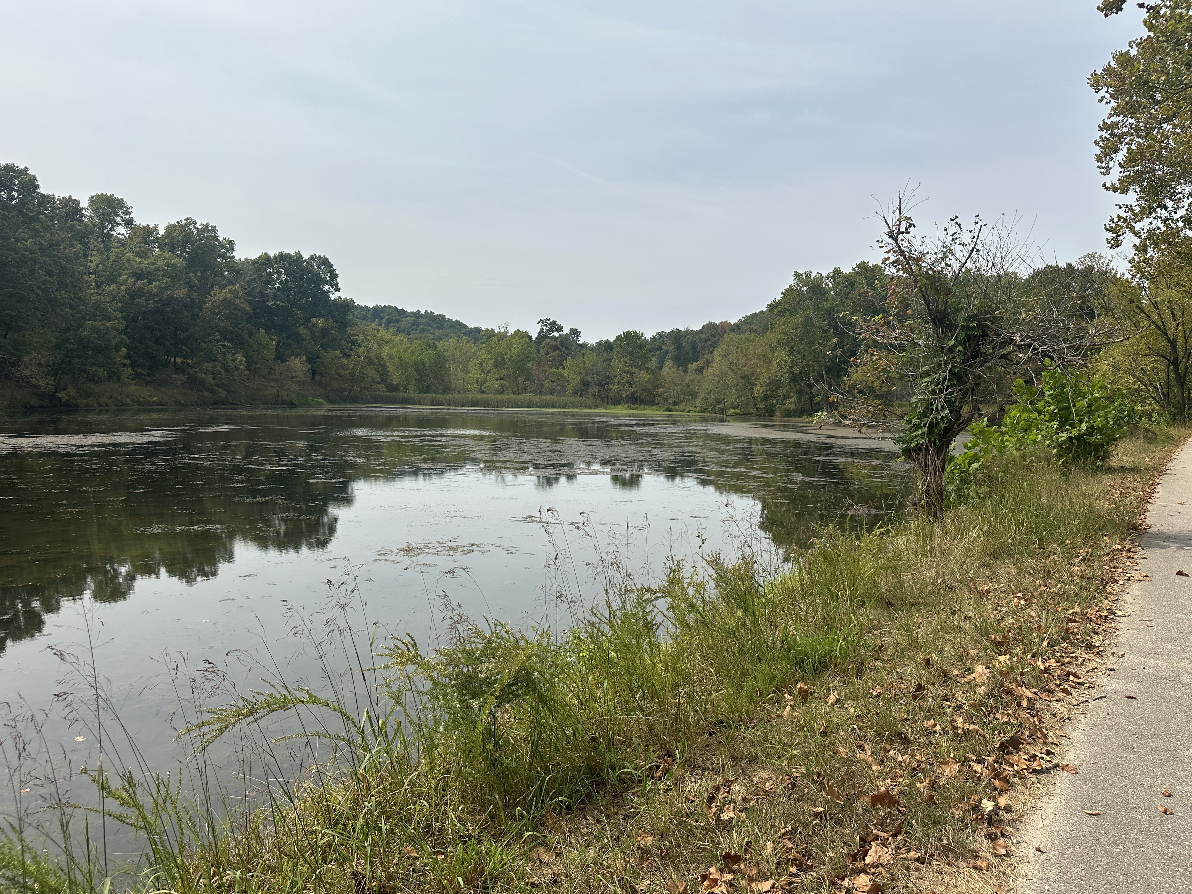 This is DOWNSTREAM from the dam. It is on the Osage River, and this water is tiny, nearly not moving, even has moss on its surface. |