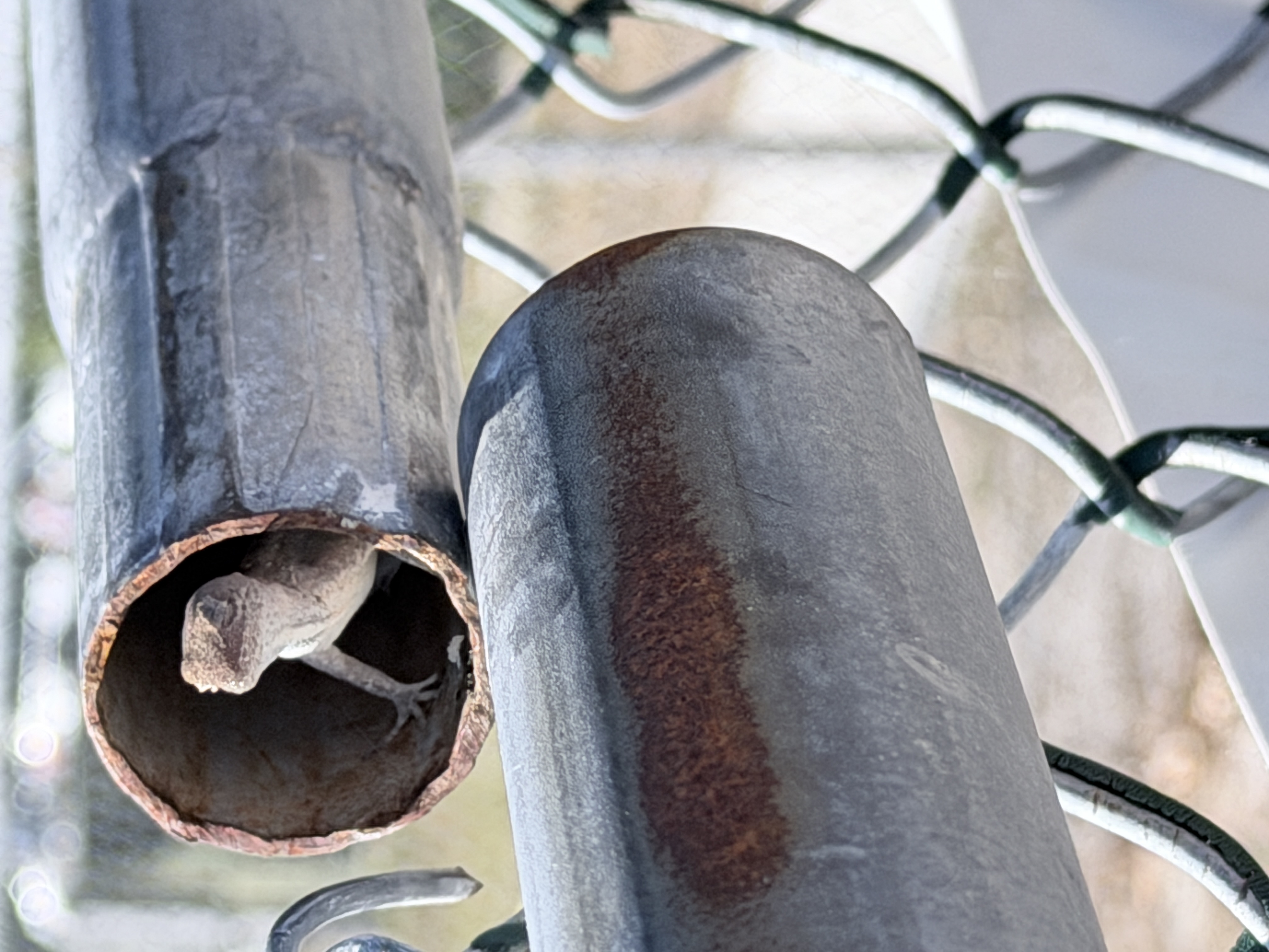 We watched our grandson play soccer on Saturday morning 11/15/25. These fellows are EVERYWHERE in Florida. This guy must be about 4 inches long, and was "hiding" in the separated upper vertical support of the surrounding fence. |